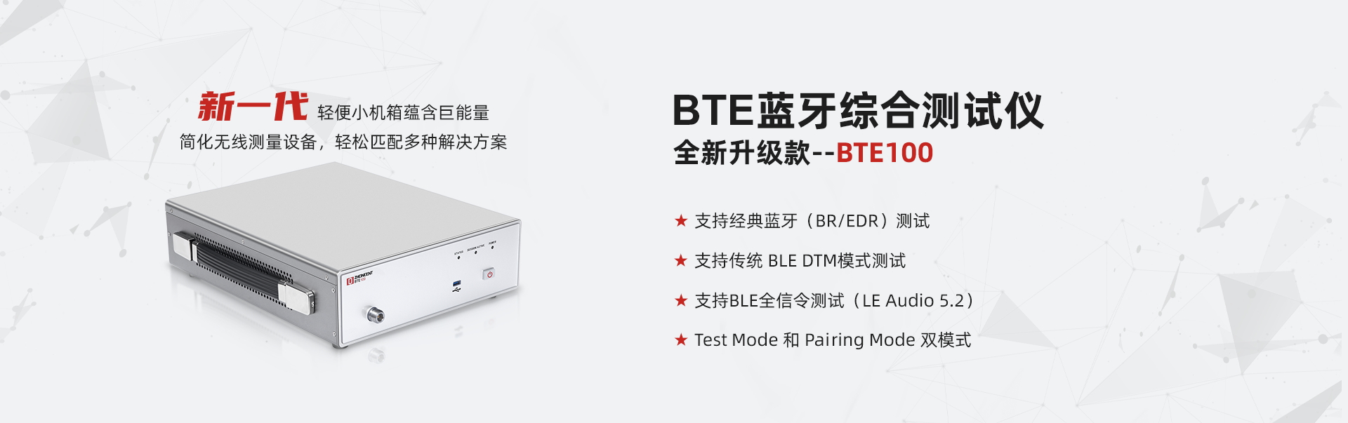 BTE100+是由中承科技獨立自主研發(fā)的新一代藍牙射頻協(xié)議綜測儀,支持藍牙設備配對信令模式下的功率、頻偏、調(diào)制、接收靈敏度、吞吐量等射頻指標精準測試,支持多種藍牙協(xié)議版本的深度解析及實時IQ數(shù)據(jù)捕獲。